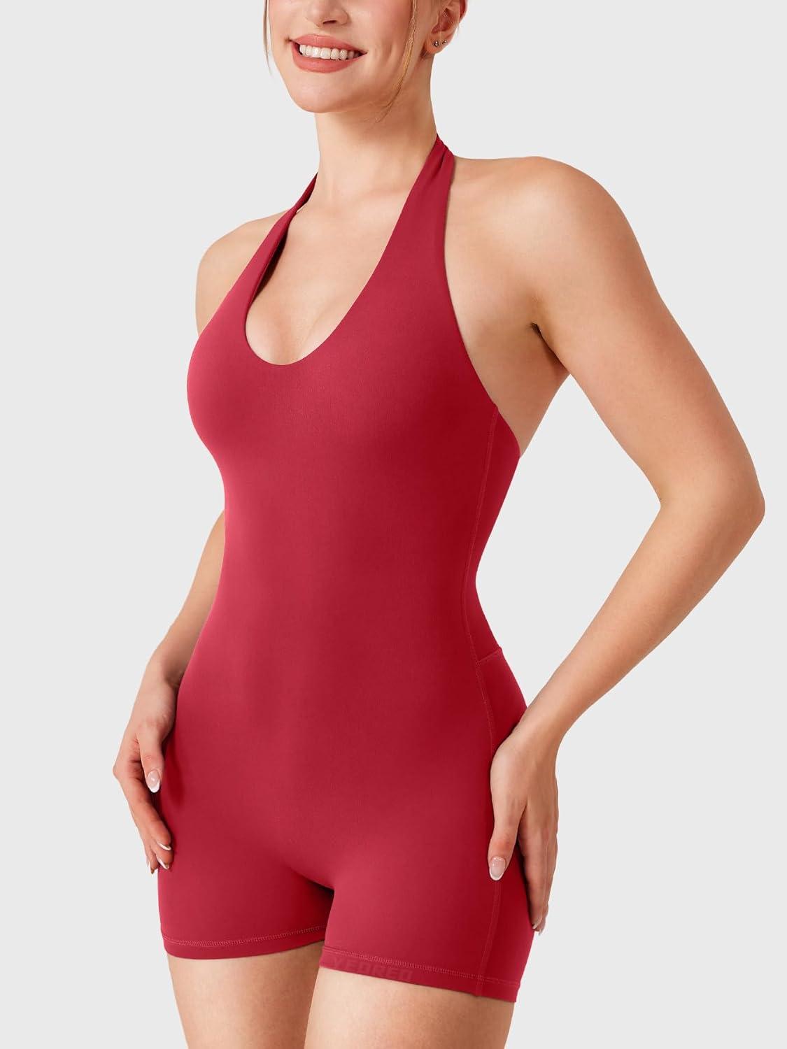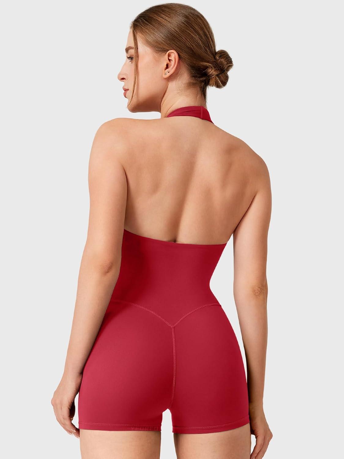 YEOREO Daiane Halter Workout Jumpsuits for Women Openback One Piece Padded No Front Seem Bodysuits V-Back Yoga Shorts Romper(Red)