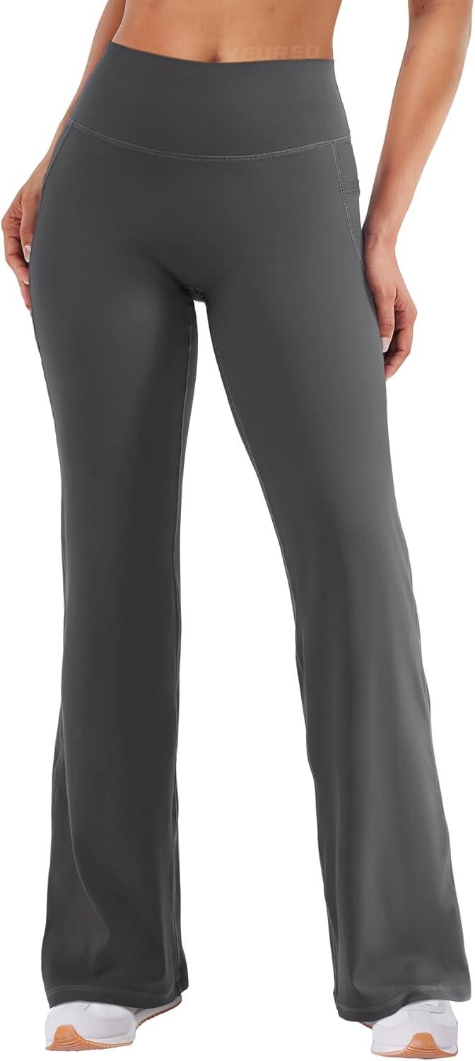 YEOREO Straight Leggings with Pockets for Women No Front Seam Workout Leggings High Waist Wide Leg Yoga Pants – 29″/ 31.5″(Dark Grey)