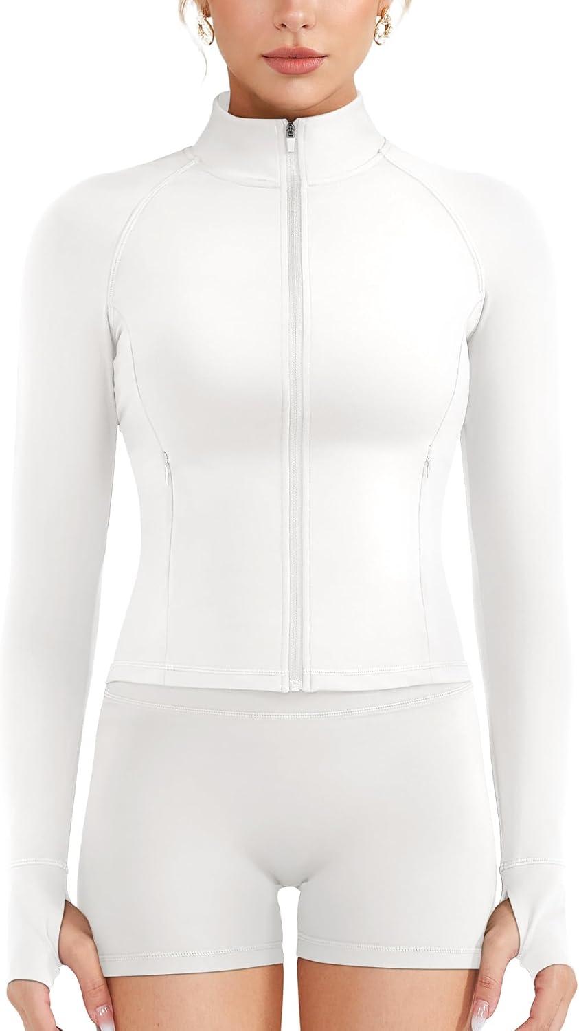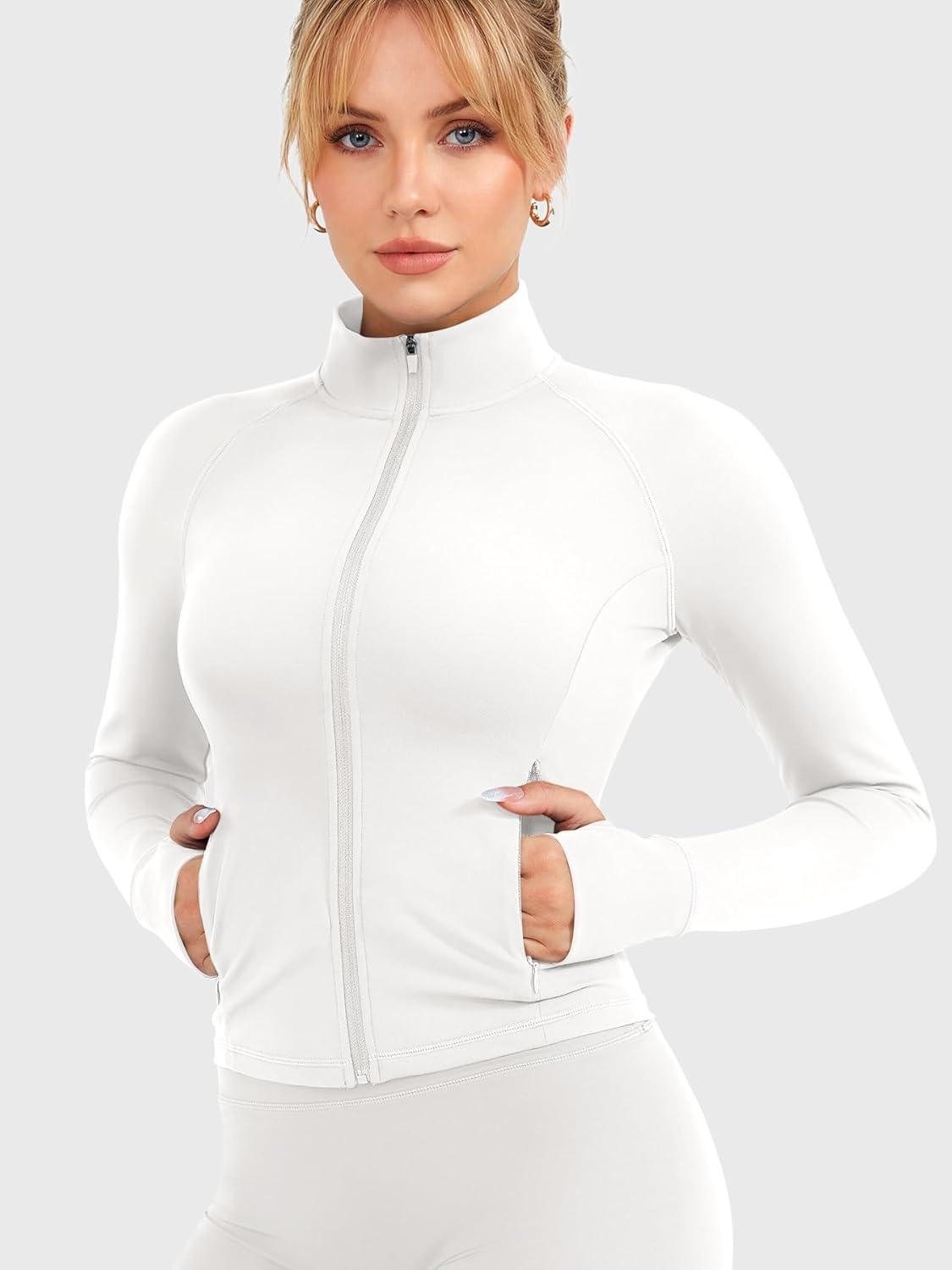YEOREO Women Full Zip Workout Jacket with Pockets Thumb Hole Long Sleeve Athletic Cropped Jackets Gym Yoga Top(White)